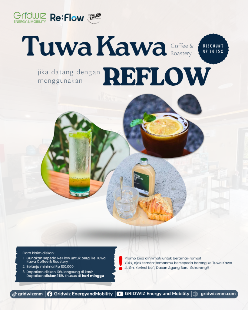 Gunakan Sepeda ReFlow Pastikan Anda menggunakan sepeda ReFlow untuk perjalanan menuju Tuwa Kawa Coffee & Roastery.